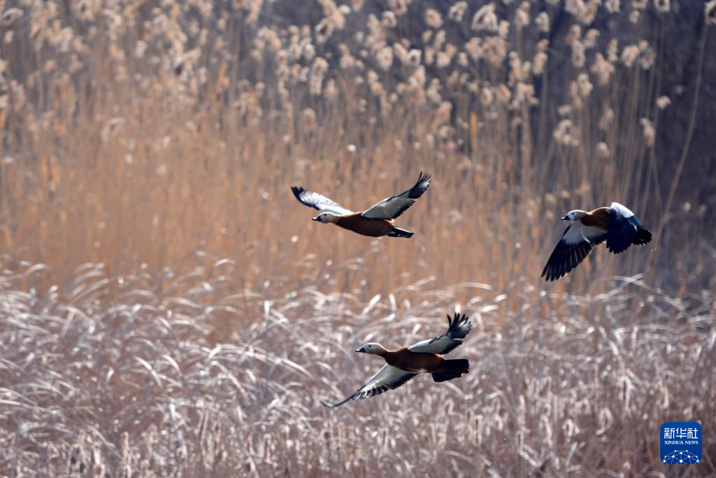 候鳥在黃河寧夏段一處濕地上空飛翔(2月26日攝)。