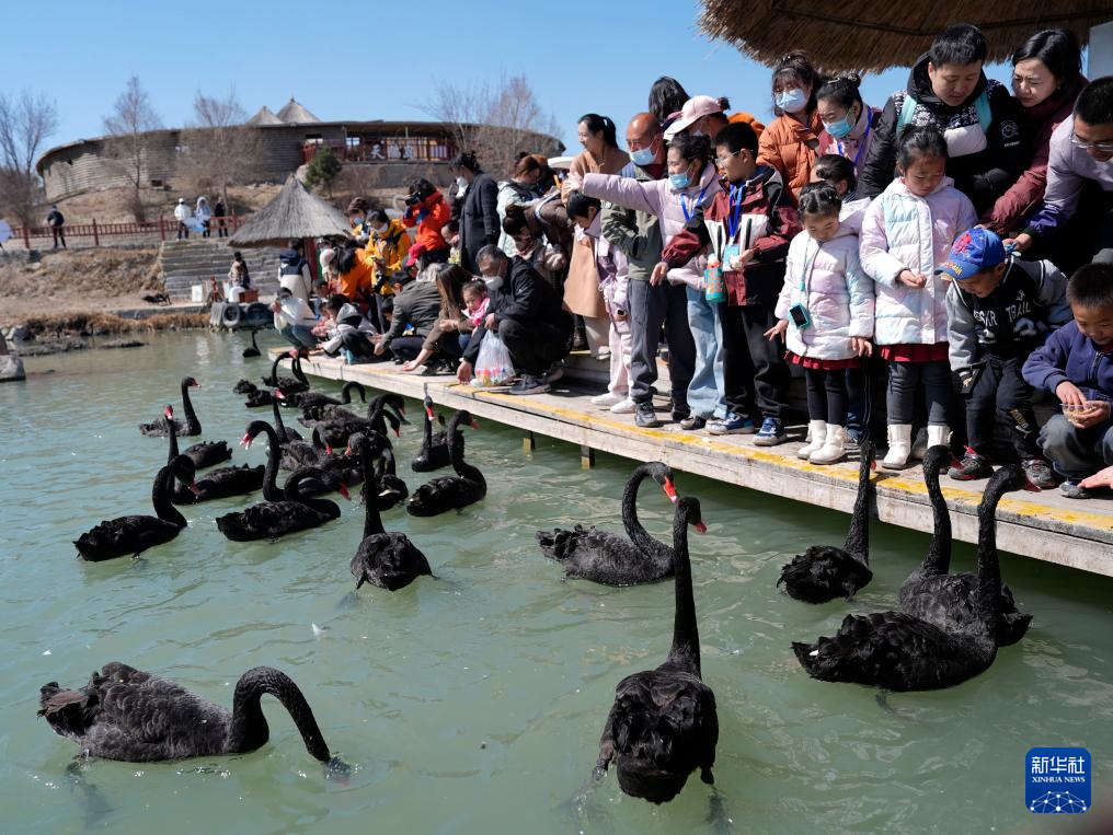 3月29日,游客在沙湖景區鳥島觀看黑天鵝。