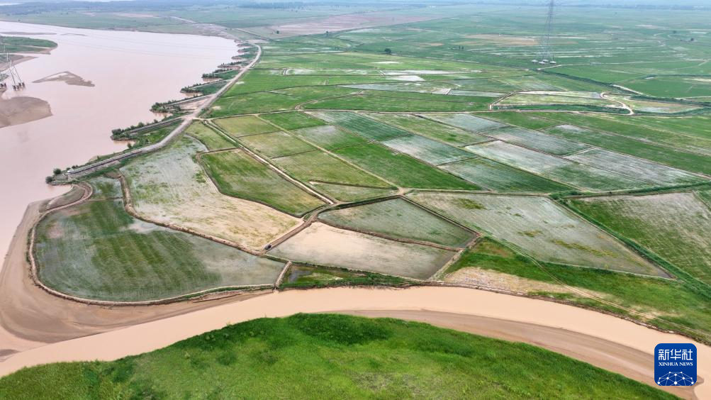在寧夏賀蘭縣境內拍攝的黃河灘涂濕地(無人機照片,6月22日攝)。