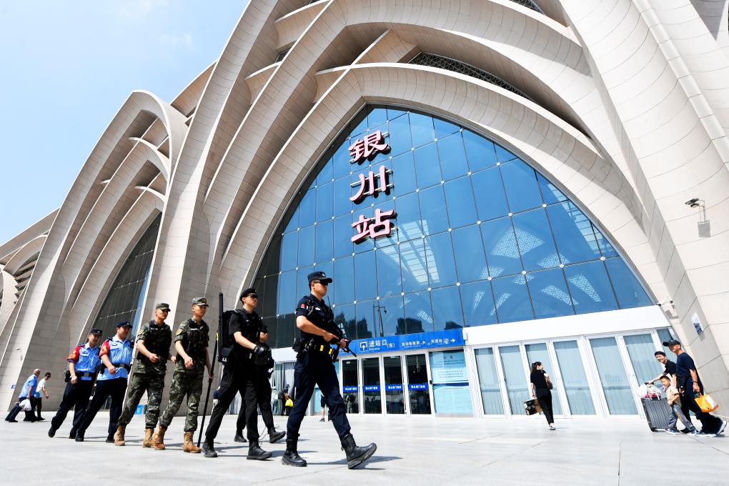 銀川鐵路公安處民警在銀川火車站廣場站崗警戒。