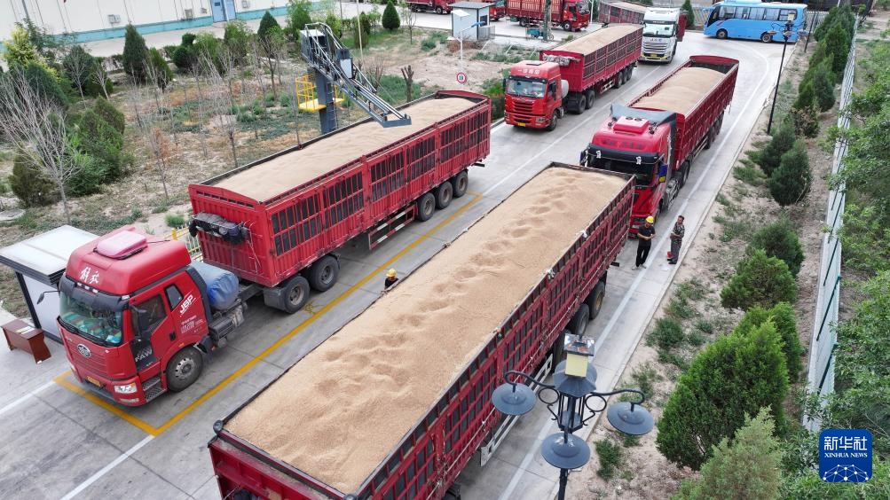 7月16日,交售糧食車輛在寧夏糧食集團銀川濱河儲備庫排隊交售糧食(無人機照片)。