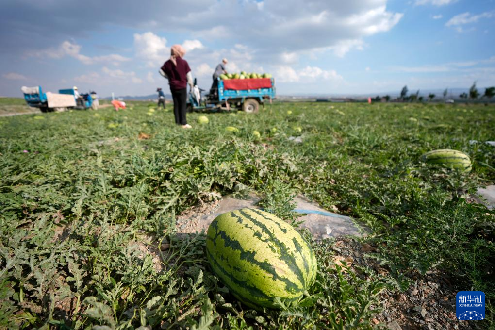 7月20日,農戶在中衛市沙坡頭區興仁鎮采摘、轉運硒砂瓜。