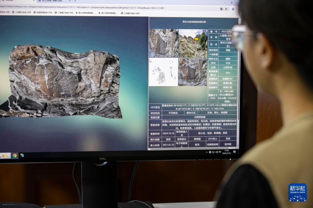 這是7月23日拍攝的賀蘭山巖畫多源數據管理平臺。工作人員將賀蘭口的形態和其中的巖畫進行高精度掃描和建模,通過電腦便可查看賀蘭口的整體情況和個體巖畫樣貌。