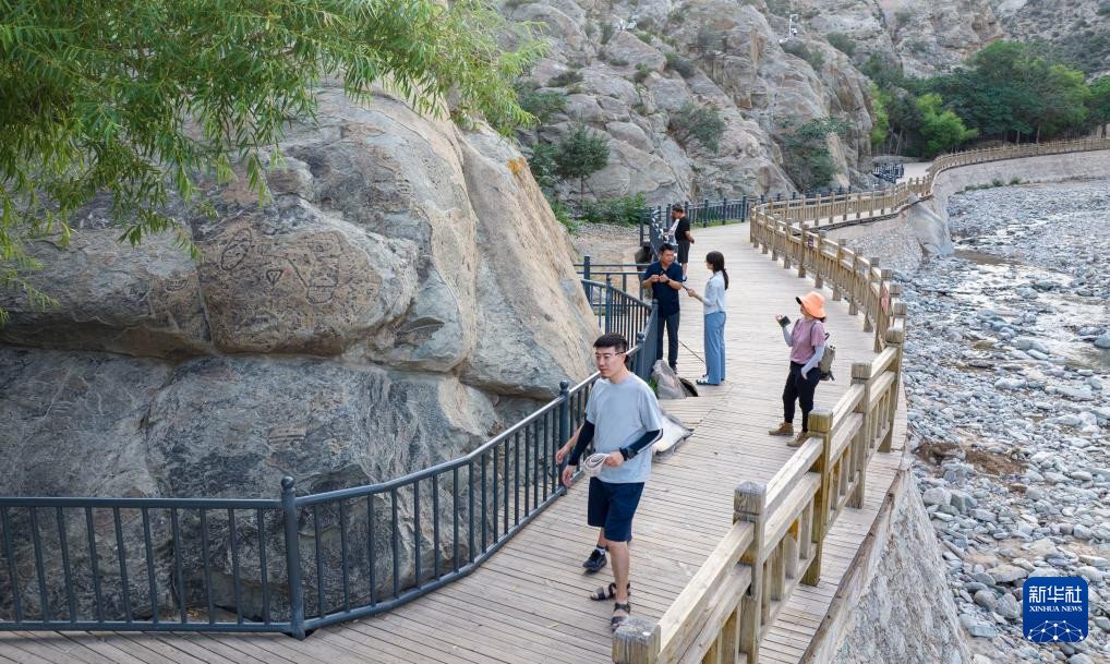7月23日,游客在賀蘭山巖畫景區游覽(無人機照片)。