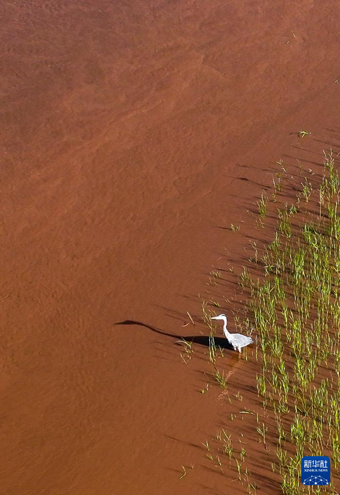 9月6日,一只蒼鷺在寧夏石嘴山市平羅縣境內的黃河灘涂濕地覓食(無人機照片)。