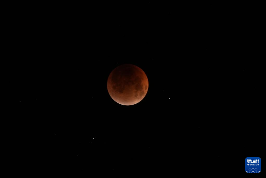 北京時間9月7日午夜至8日凌晨,全球多地天宇上演壯觀的月全食現象。月全食的原理是月、地、日運行至一條直線時,月球進入地球的本影,太陽投射在月球上的光完全被地球擋住。由于地球大氣層對太陽光有折射和散射作用,其中波長最長的紅光落在月面上最多,因而出現“紅月亮”。新華社記者 王鵬 攝