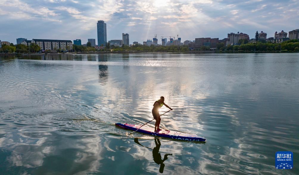 9月17日,市民在銀川市海寶公園內進行水上運動(無人機照片)。
