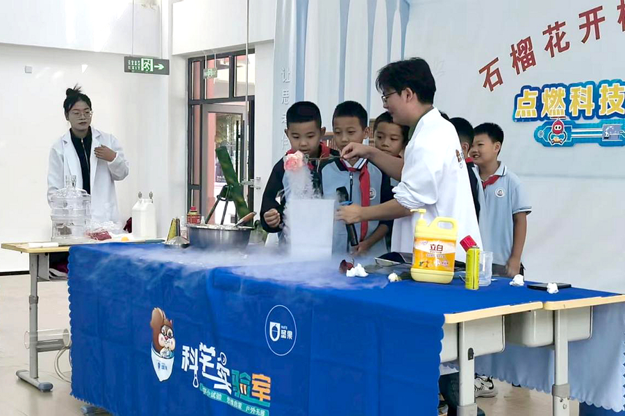 科學實驗現場的同學們情緒高漲,成了活動的焦點?!按蠹易⒁饪?,我現在要把這團火放在手上!”隨著實驗老師話音落下,一團藍色火焰在老師掌心跳躍?!袄蠋?,你不燙嗎?”孩子們驚嘆不已?!斑@是因為燃料燃燒時產生的熱量被水分吸收,加上燃燒速度快,所以手掌不會受傷?!睂嶒灷蠋熞贿叢僮?,一邊解釋其中的科學原理。隨后,“粉碎玫瑰花”“液氮大炮”“馬德堡半球”“騰云駕霧”等9個趣味實驗接連上演,同學們不僅驚呼連連,還親自上臺體驗,沉浸在液氮營造的夢幻“仙境”中,在歡樂中播下了科學的種子。