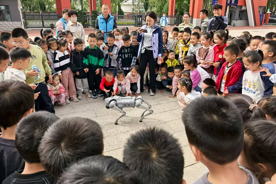 機器狗展示區域同樣人氣爆棚。講解員操控機器狗演繹舞蹈、握手、跳躍、伸懶腰等一系列靈活多變的動作,機器狗憨態可掬的模樣逗得師生們開懷大笑。講解員還向孩子們介紹了機器狗的工作原理:“它身上裝有多個傳感器和電機,就像我們的眼睛和肌肉一樣,能感知周圍環境并做出動作?!辈簧俸⒆訃跈C器狗身邊,仔細觀察它的關節和傳感器,眼神里滿是對科技的向往。