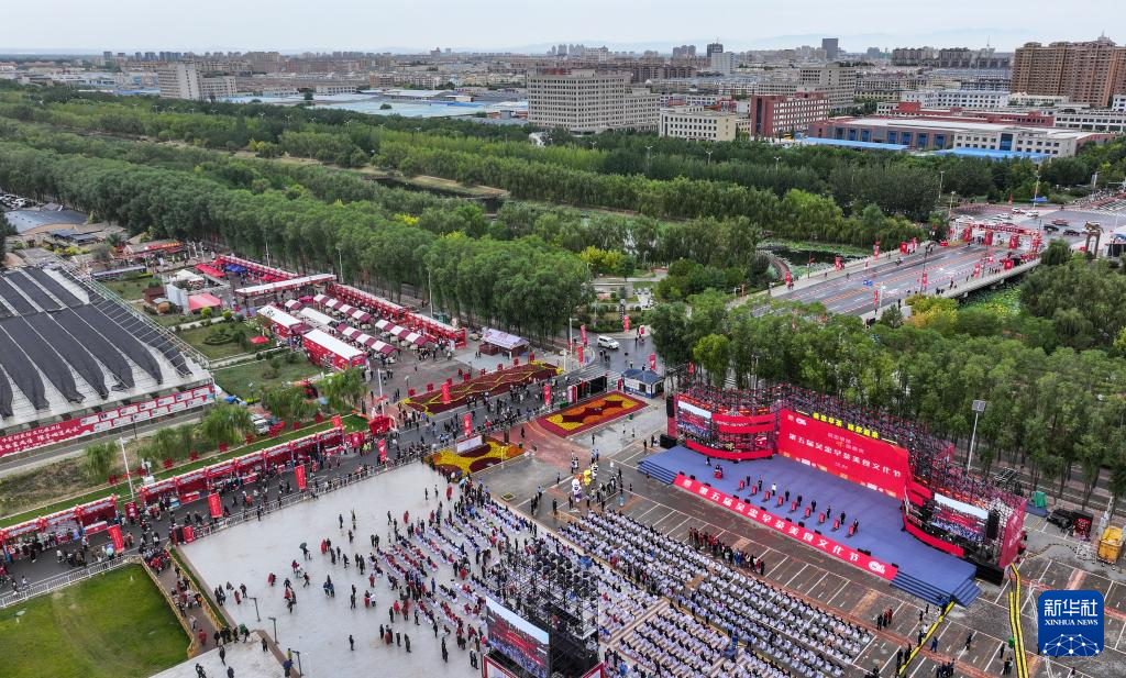 這是10月1日在在寧夏吳忠市利通區牛家坊民俗文化村拍攝的第五屆吳忠早茶美食文化節活動現場(無人機照片)。新華社記者 馮開華 攝