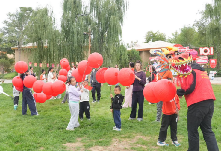 與此同時,賀蘭山腳下的蘭一生態園圍繞親子互動與創意體驗,推出系列特色活動?!白鎳胶悠闯鰜怼弊匀黄磮D挑戰賽在蘭多多親自然樂園舉行,孩子們在家長陪伴下拼出完整的中國地圖,齊聲合唱《我和我的祖國》,并放飛承載祝福的空飄氣球?!懊韧拊旒t龍?燈籠趣游園”活動也吸引了眾多家庭參與,親子共同制作燈籠并串聯成“國慶紅龍”,提燈游園,展現出一幅家國同樂的溫馨畫面。