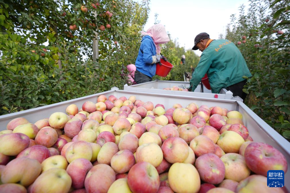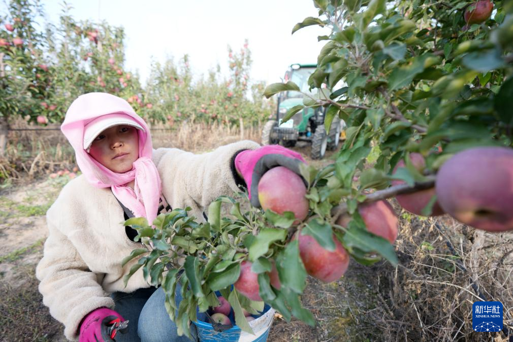 農戶在中衛市沙坡頭區“旱蘋果”種植基地采摘蘋果(10月25日攝)。