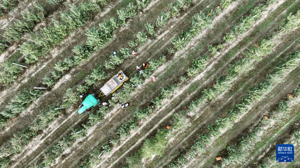 農戶在中衛市沙坡頭區“旱蘋果”種植基地采摘蘋果(10月25日攝,無人機照片)。