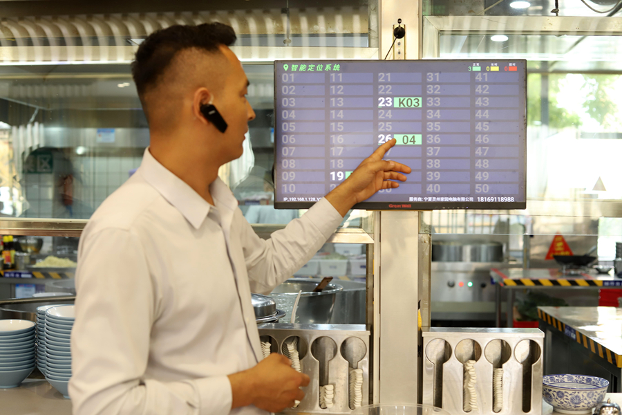 8點許,寧夏回族自治區吳忠市利通區馬伊飯莊的早茶迎來人頭攢動的高峰期。取餐處“嚴格把關八不上”標語醒目,旁側屏幕實時滾動備餐進度。